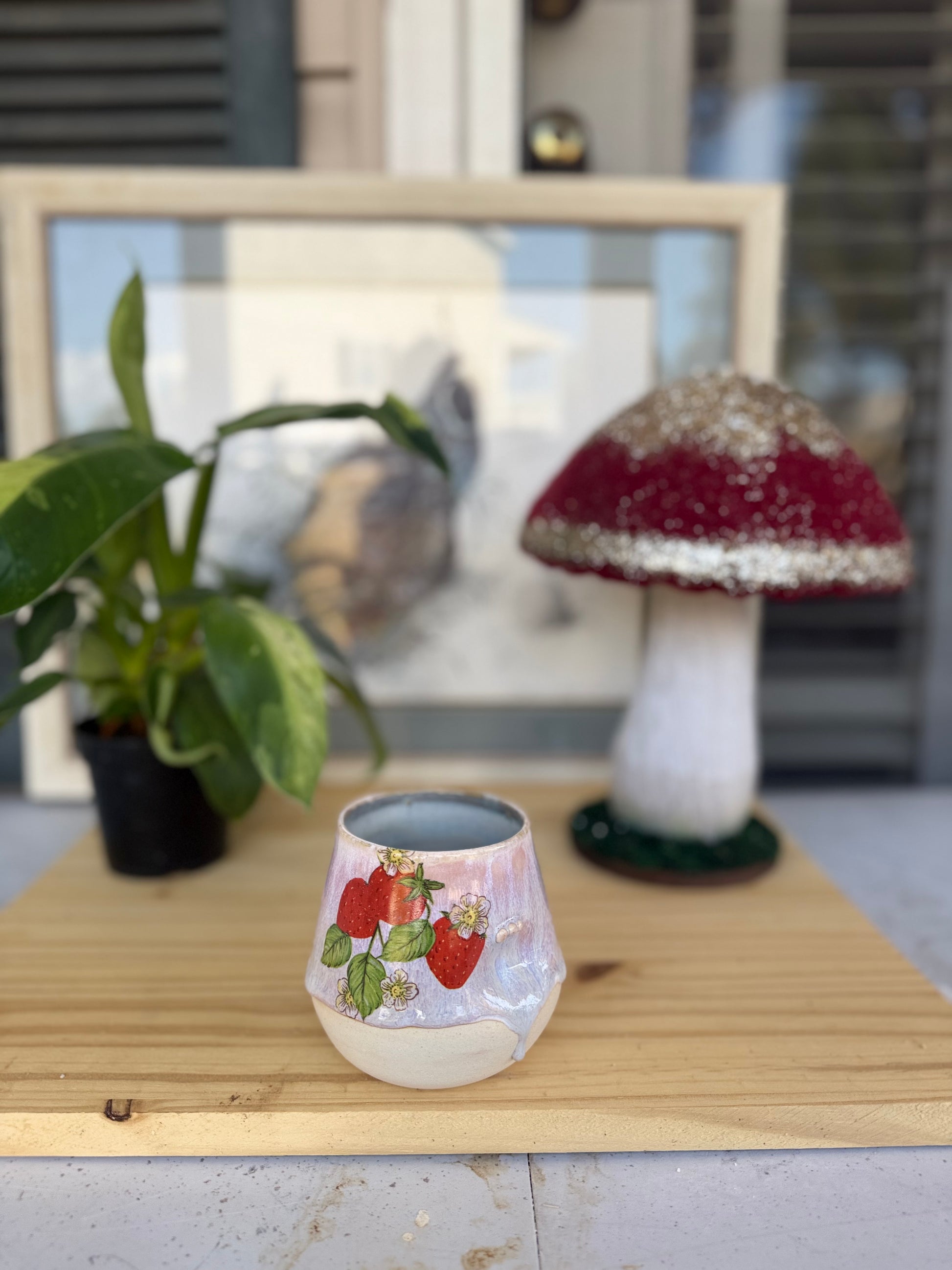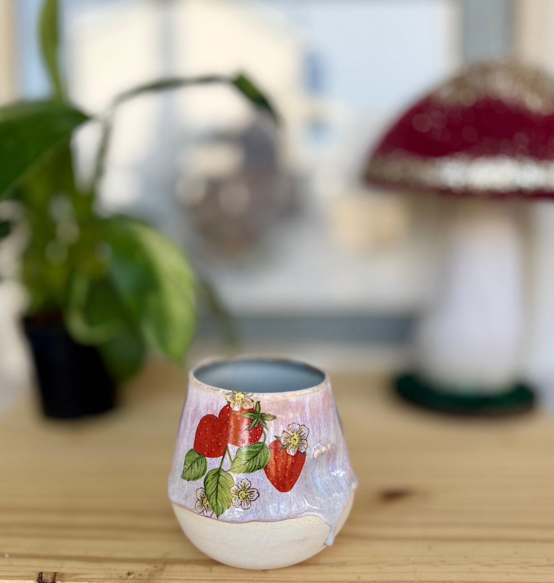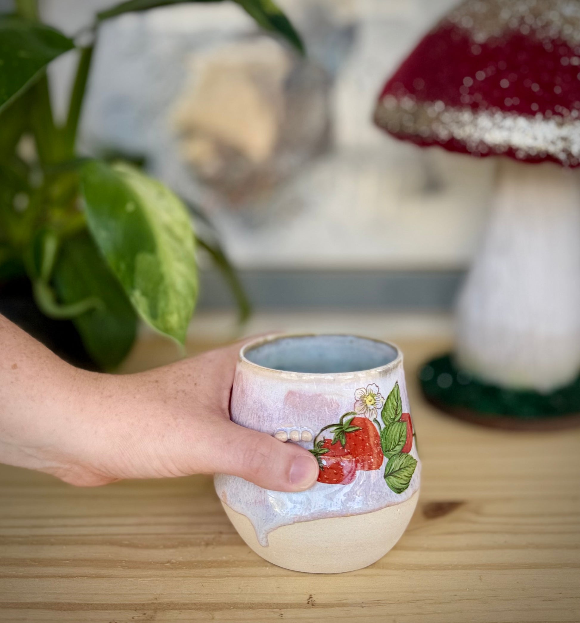 Thumb-grip tumbler with strawberries, because strawberries are the bee's knees.